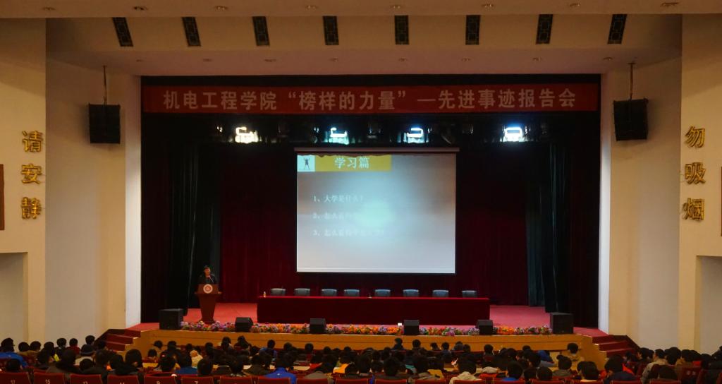 举办2014年“榜样的力量”—先进事迹报告会。 院党委副书记刘光老师和全体辅导员参加了此次报告会。本场先进事迹共邀请了7名2014年优秀大学生和2个优秀班集体。他们中既有学术达人、全能达人又有文艺达人。报告中,学长们纷纷结合自己的亲身经历谈到作为新一代大学生要把学习放在第一位,同时要积极参加各项社会活动以及各种学科竞赛,找到适合自己发展的兴趣,丰富自己的大学生活,全面提升自己的素质和能力,珍惜大学四年的宝贵时间。在2014年优秀班集体宣讲过程中,两位班长都分享了他们是如何协同全班全体成员建设一个优秀的班集体,作为班长又是如何当好一名带头人。在场同学纷纷感受讲座触动人心,受益匪浅。同学们都表示:“要借此榜样的力量的报告会,把优秀当成一种习惯,向榜样学习,向优秀学习。” 责任编辑:季瑞林