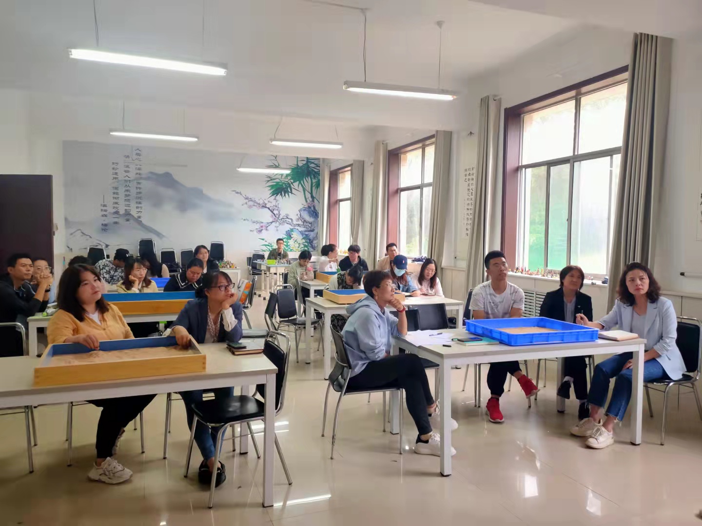 分享交流会上,赵丹凤老师以“团体沙盘游戏技术在辅导员工作中的应用“这个主题深入浅出地从“沙盘心理技术的历史简介、沙盘心理技术的理论基础、沙盘心理技术的有效作用、团体沙盘操作程序以及团体沙盘游戏技术在辅导员工作当中的应用“进行了分享,赵老师结合自己丰富的团体沙盘游戏的工作经验,通过列举、剖析大量的真实案例向大家介绍了团体沙盘游戏在班会、学生骨干培训、选拔学生干部、课堂教学以及党课教育中的应用,她在讲座中提到团体沙盘游戏可以帮助大学生增进交流,提高团队协调能力,提升团队凝聚力,增进友谊,解决心理问题,可以广泛应用于心理课、社团活动、团队建设、宿舍人际交往等团体活动中,为大学生思想政治教育和心理健康教育提供更加新颖的方式。期间辅导员老师们积极互动迸发思维碰撞的火花,收获颇丰。