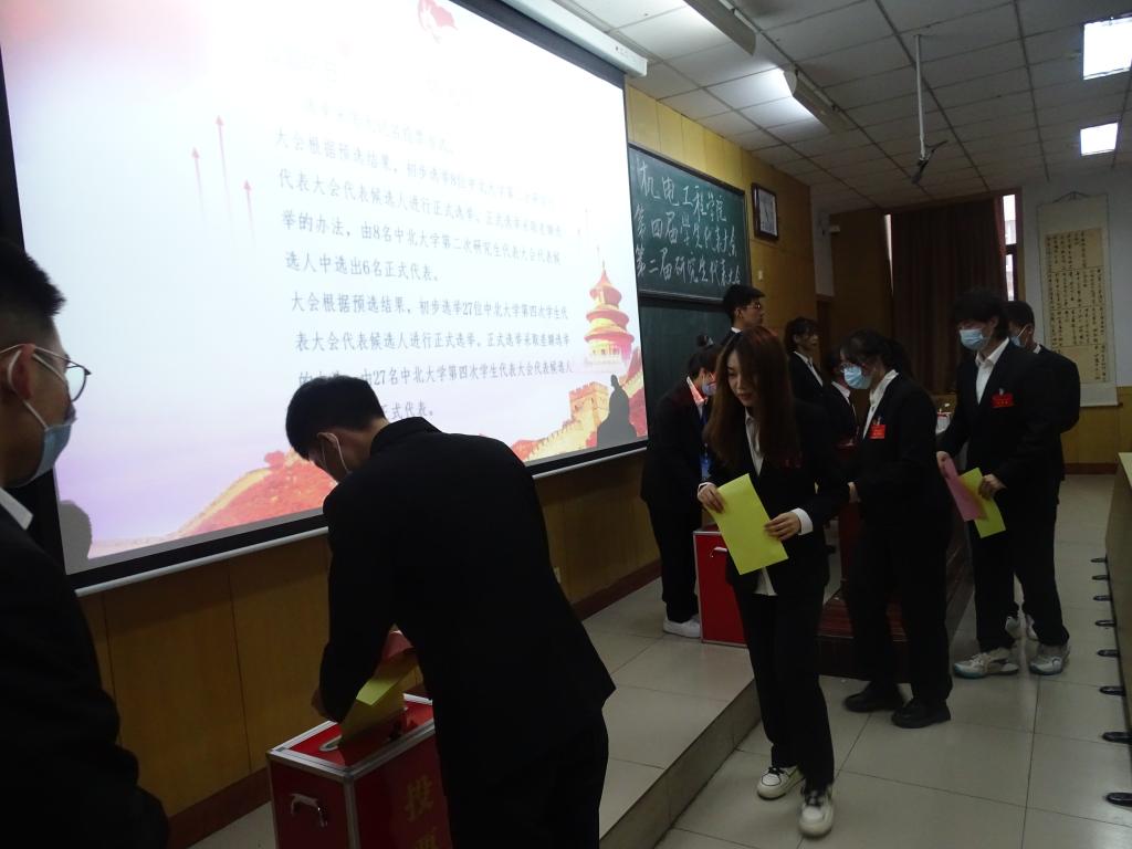 学生代表大会、研究生代表大会候选人的选举,主持人宣读选举办法并介绍各位代表候选人的基本信息,随后与会代表依次上台进行投票。最后经过公正公开的选举,确定并宣布了学生代表、研究生代表名单及下一届学生会、研究生会主席团成员名单,大会在团歌声中圆满结束。