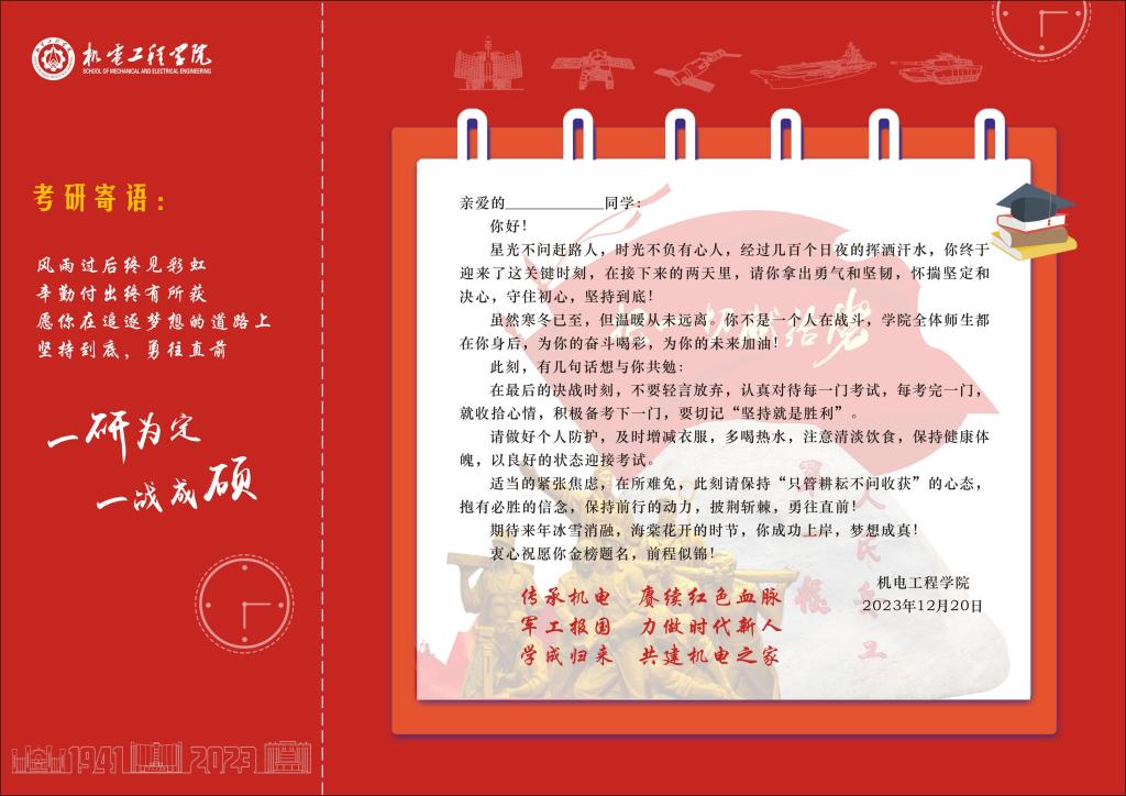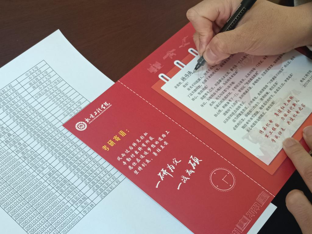 于2023年12月21日在文瀛17号宿舍楼为备战考研的同学们送去了意义非凡的祝福卡和考研文具包。祝福卡精心设计并由AG娱乐城