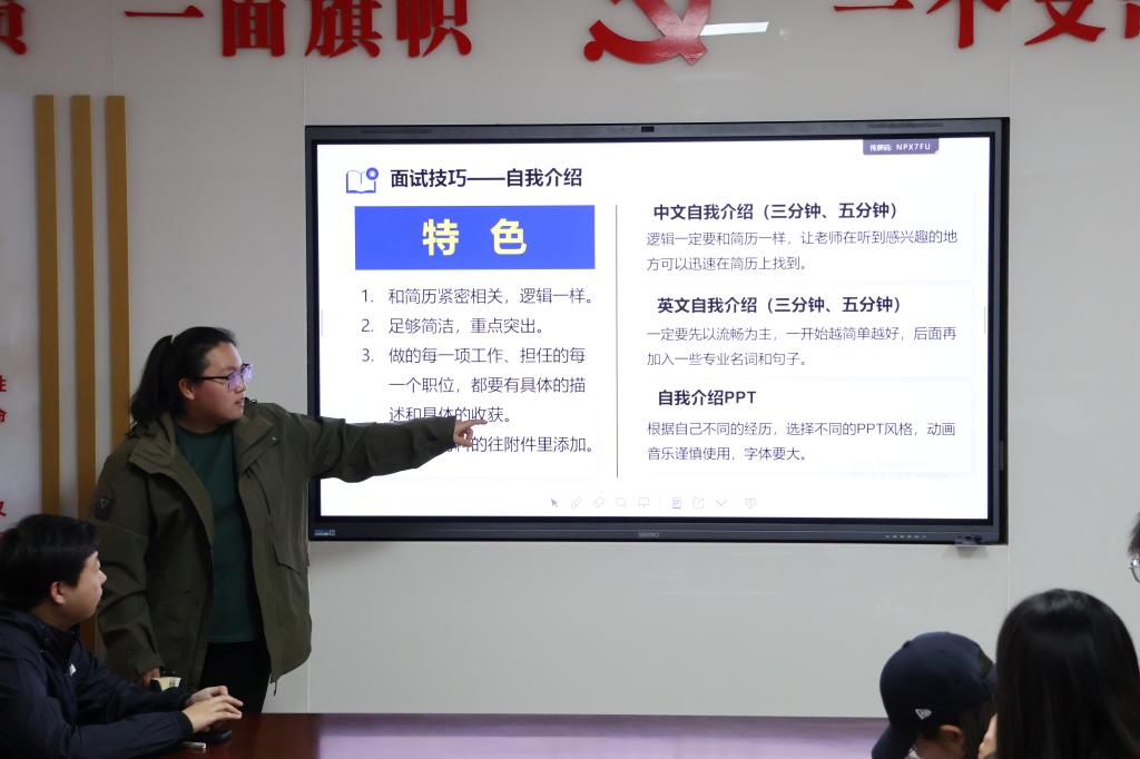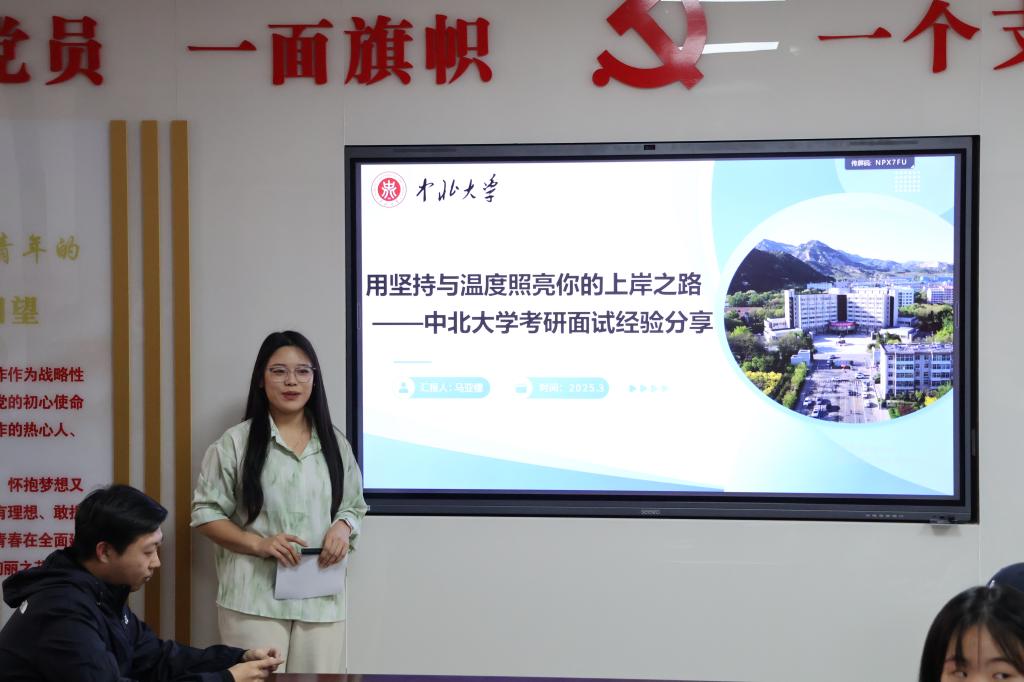 随后,三位在考研复试中取得优异成绩的学长学姐——刘杨、马亚檬和朱子文,分别分享了他们的备考经验和复试技巧。学长学姐们结合自身经历,围绕复习计划的制定、专业知识的重点突破、应试技巧的提升等核心问题展开细致讲解。他们通过具体案例分析了考研复试各阶段的注意事项,并针对跨专业复试等同学普遍关心的问题,给出了切实可行的建议。现场同学认真聆听,仔细记录要点,部分同学还就个人困惑与学长学姐进行了互动交流。