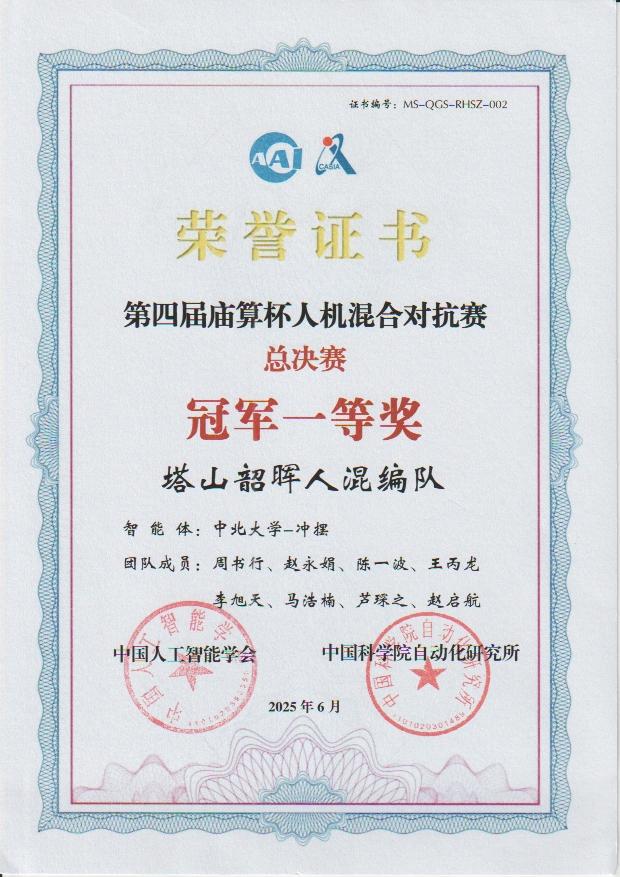 硕士研究生周书行带队组建的“冲摆”队荣获智能体赛、人机混合编组赛两个赛道的冠军,充分彰显出AG亚游官网