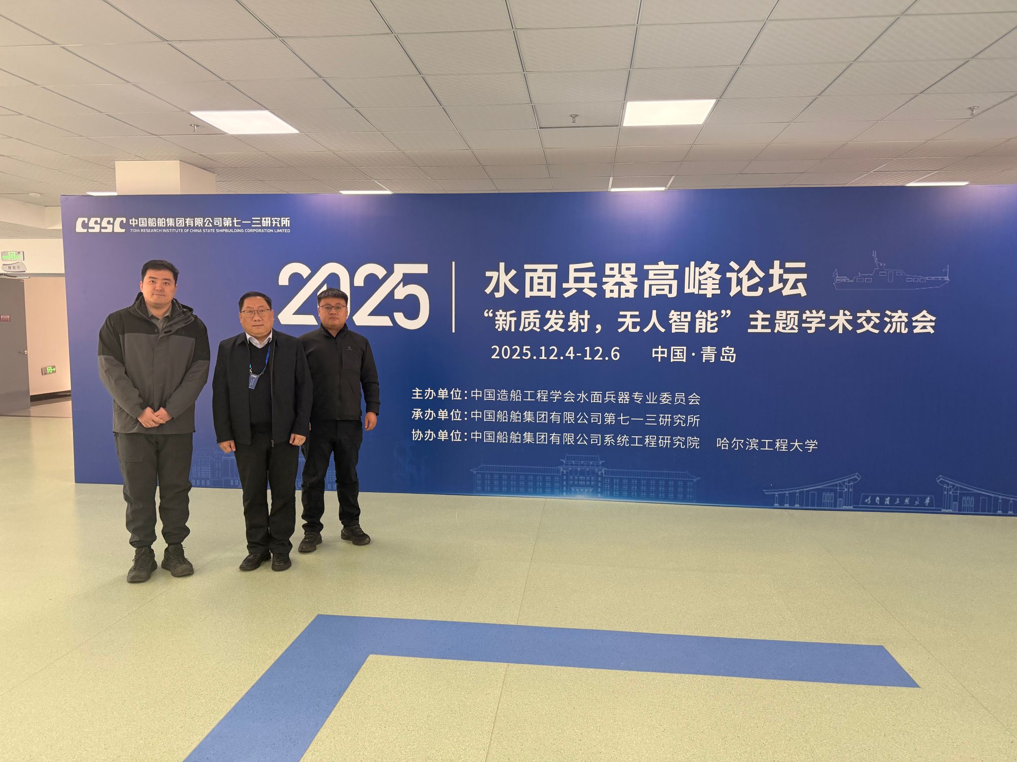 2025年12月4日至6日,以“新质发射,无人智能”为主题的2025年水面兵器高峰论坛会在山东青岛隆重举行。论坛由中国造船工程学会水面兵器专业委员会主办,中船第七一三所承办,中船系统工程研究院和哈尔滨工程大学协办,是国内水面兵器领域具有较高专业影响力与学术引领作用的重要科技交流平台。中国造船工程学会等全国30余家单位共计50余位专家学者与企业代表共同探讨行业发展趋势与关键技术突破。院长李强教授、鹿麟副教授和孙志群副教授受邀出席本次盛会,积极参与多项交流环节,与同行专家进行了广泛而深入的交流。