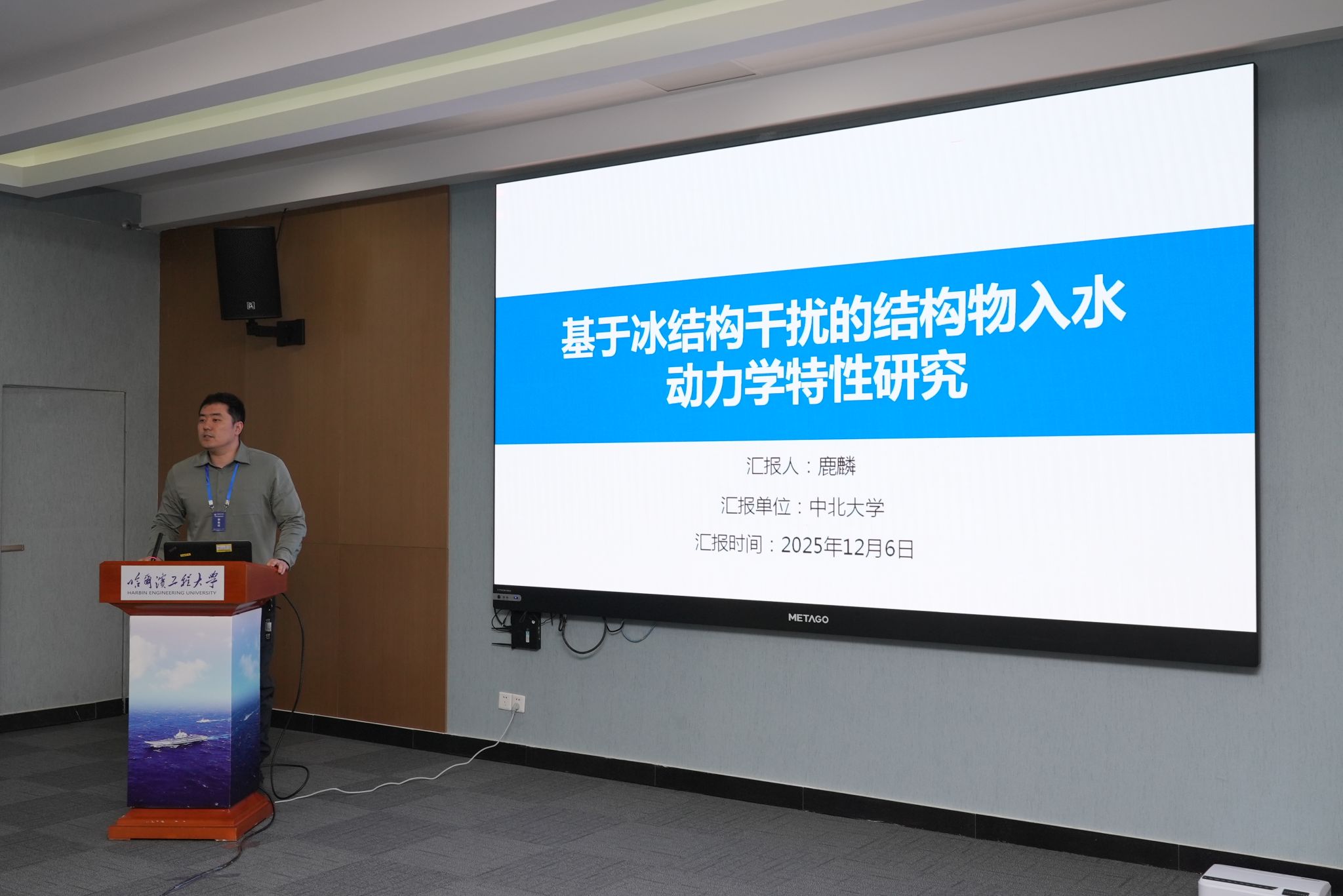 鹿麟副教授作了主题为《基于冰结构干扰的结构物入水动力学特性研究》的主题报告。围绕复杂海洋环境下结构物入水过程的关键力学问题,系统分析了冰结构干扰对入水载荷、运动稳定性及流体动力特性的影响机制,提出了一系列具有前瞻性的分析方法和优化思路,引起了与会同行的高度关注与积极评价。