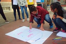 下午2时许,活动正式开始。首先,殷老师带领同学们玩了几个热身活动活跃一下现场的气氛。由于这是第一次团体心理辅导活动,同学们之间也都不怎么认识,所以,殷老师要求同学们设计一个能体现自己个性特点的“名片”,然后相互进行介绍交流,使大家之间有了更深刻的认识。随后,在此基础上,殷老师将同学们分成3个队伍,进行相互竞争,活动的气氛也推向了高潮。通过竞争,同学们对于团体有了更深刻的体会,认识到了团体中重要性。最后,同学们纷纷发表了自己对于本次活动的感悟和理解,殷老师对本次活动做了总结。