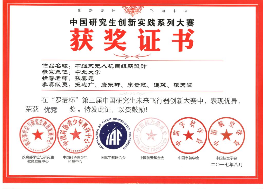张春元老师指导的、由王志广等五位研究生完成的“中继式无人机自组网设计”项目获得大赛优秀奖,我校获得优秀组织奖。