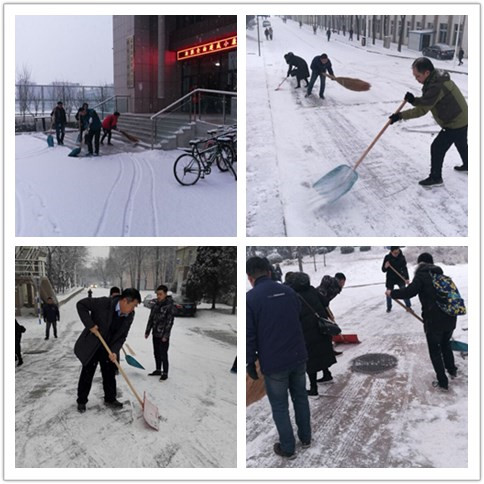 党委及时动员,综合办老师提前准备好扫帚、铁锨等扫雪用具,师生和物业管理人员开展扫雪活动,大家齐心协力、互相配合、有序清扫、经过一小时的努力,科学楼周围、瑾瑜国际会议中心周围、游泳馆前斜坡等易导致安全隐患之处的冰雪很快被清除干净,有效保证了师生出行安全。