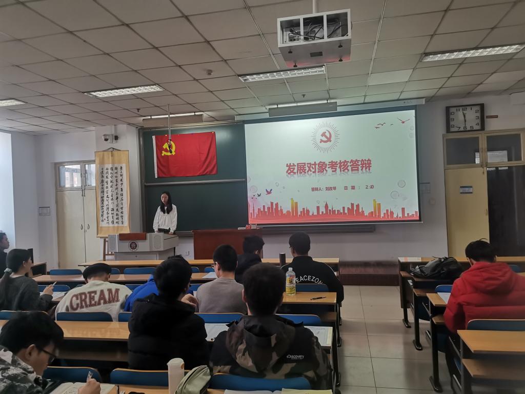 首先,支部组织委员殷乐章同志介绍了此次答辩的流程及评分过程中的注意事项。在发展对象答辩之前,支部书记李晶晶老师要求各位党员在发展对象答辩时要认真聆听,打分要公平公正。李晶晶老师强调不论是党员还是发展对象都要在生活中以高标准严格要求自己,并且希望大家都可以为党支部的建设贡献自己的力量。紧接着,各位发展对象按顺序依次上台答辩。每位同学都对党组织充满向往,积极向党组织靠拢。大家结合自身情况,立足当下,充分准备,从个人介绍、对党的认识、入党动机、学习生活情况、获奖情况及未来规划等几方面向党组织进行了汇报,答辩内容各有特色。支部党员们秉承着认真严谨的态度,仔细聆听发展对象的答辩内容,严格按照评分标准评分。最后,支部成员对发展对象的党材进行打分。
