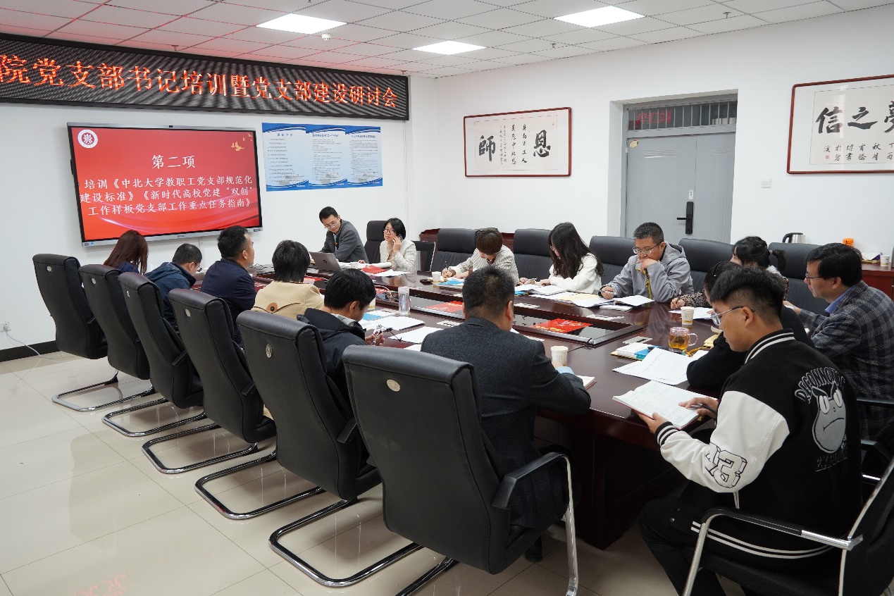 会上,党委书记赵永娟介绍了本学期党委的九项工作要点,重点强调要加强全院师生党员的凝聚力,加强党支部的规范化建设。同时她向与会人员培训了《中北大学教职工党支部规范化建设标准》《新时代高校党建“双创”工作样板党支部工作重点任务指南》两项内容,希望教工党支部书记熟悉党支部的规范化建设标准,尤其是落实好“三会一课”制度,并要求各党支部围绕建设样板党支部工作重点任务开展好支部的各项工作。党委副书记刘光给参会人员培训了《中国共产党党员教育管理工作条例》《普通高等学校学生党建工作标准》《中北大学学生党支部规范化建设标准》三项内容,希望学生党支部书记按照学生党支部规范化建设标准建设好支部,并做好全体学生党员的教育管理工作。院组织委员张凤林给参会人员培训了《中北大学发展党员工作实施细则》,详细介绍了中国共产党发展党5个阶段25个步骤的工作流程,为各党支部发展党员工作提供了实用的工作指南。