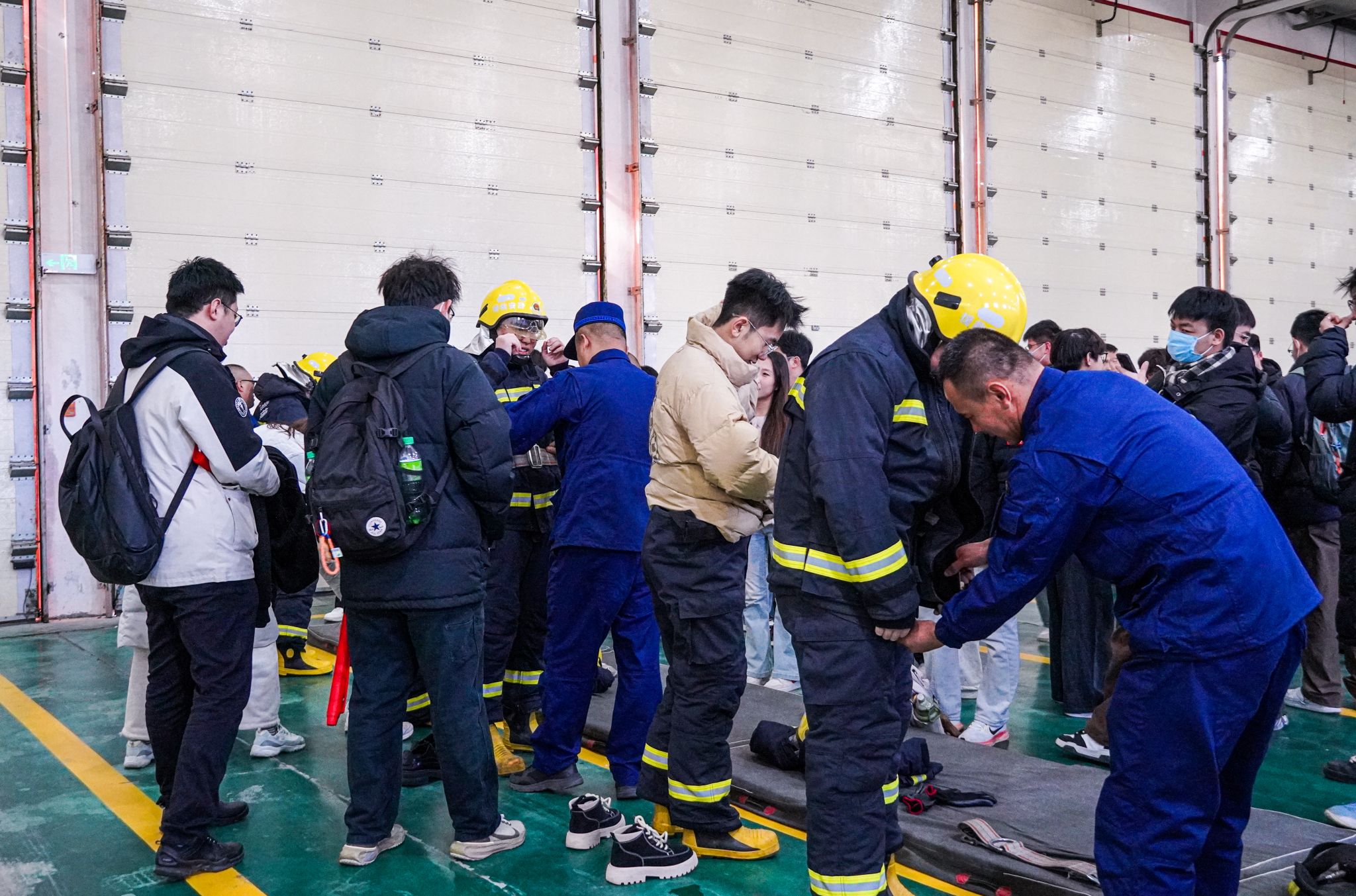 活动首站抵达汾阳市吕安危险化学品应急救援基地。在基地专业人员的引导与讲解下,师生们首先观摩了火场救援演示与无人灭火车灭火实操演示。逼真的场景、规范的流程,让大家对消防救援工作的专业性与危险性有了直观深刻的认识。随后,在室内培训环节,专业的消防救援知识讲解进一步丰富了师生们的安全理论储备。学生代表们还踊跃参与了灭火防护服穿戴体验及日常训练模拟,切身感受了消防员肩负的责任与艰辛。