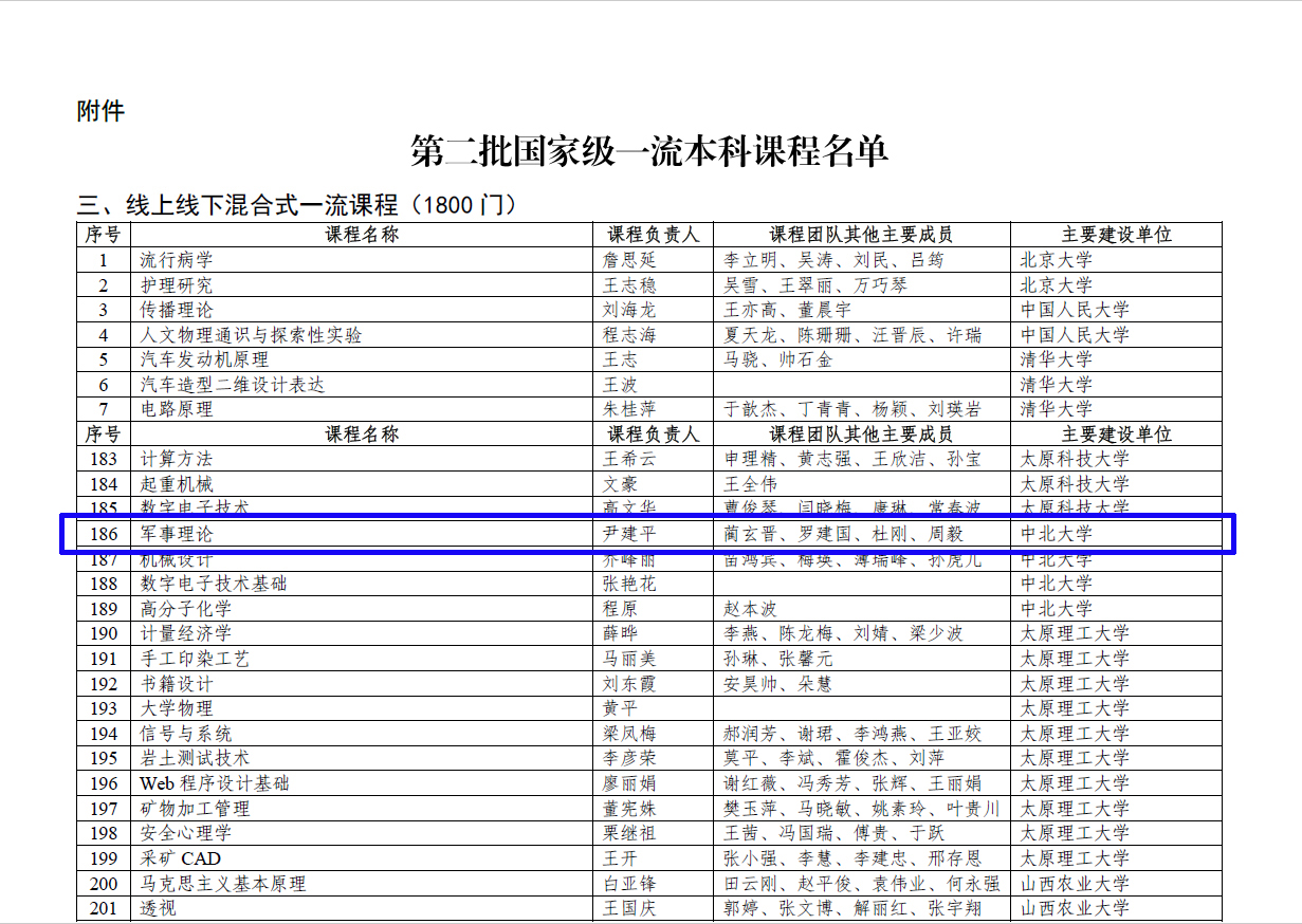 近日,教育部公布了第二批国家级一流本科课程名单,AG亚游官网 尹建平教授牵头申报的《军事理论》,被认定为线上线下混合式国家级一流本科课程。
